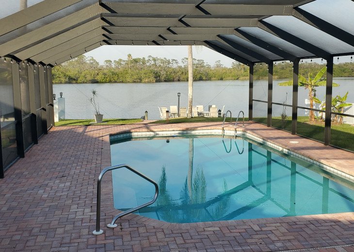 Make life-long memories at this newly remodeled unique and family-friendly home directly on the river. Watch the boats go by or rent one nearby. Enormous screened in pool area is the perfect place to enjoy the warm Florida weather and stay cool in the pool or warm in the winter. An outdoor kitchen/bar area boasts plenty of seating. Beds for 14 and a large great room with plenty of room to relax and entertain....